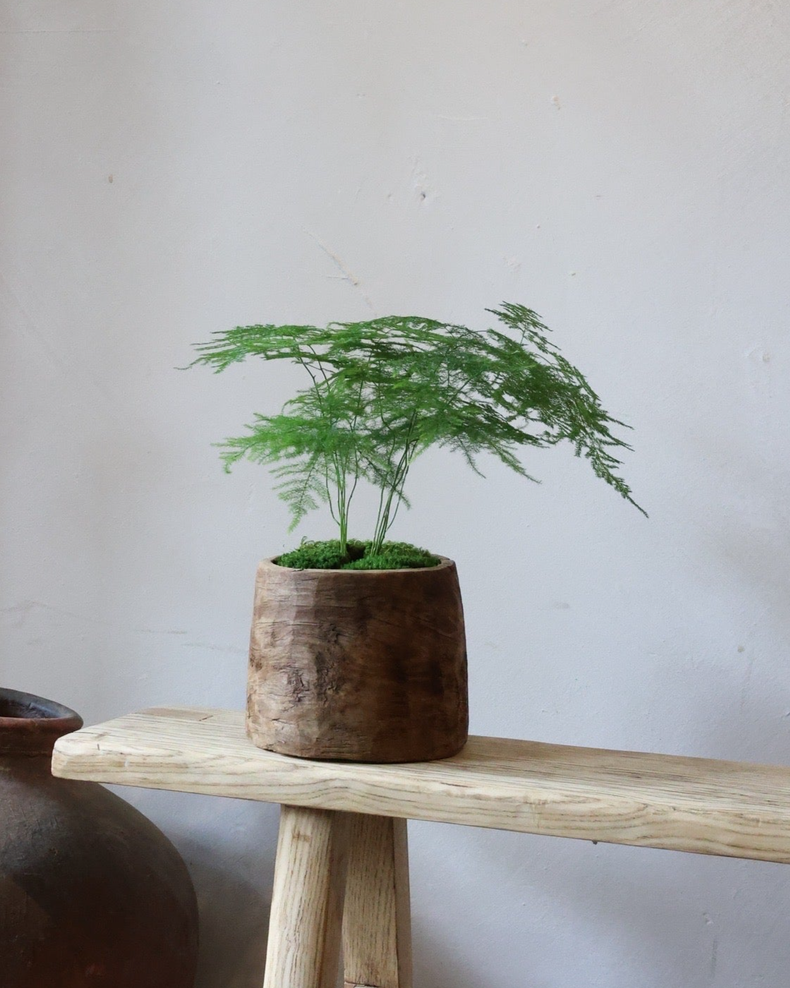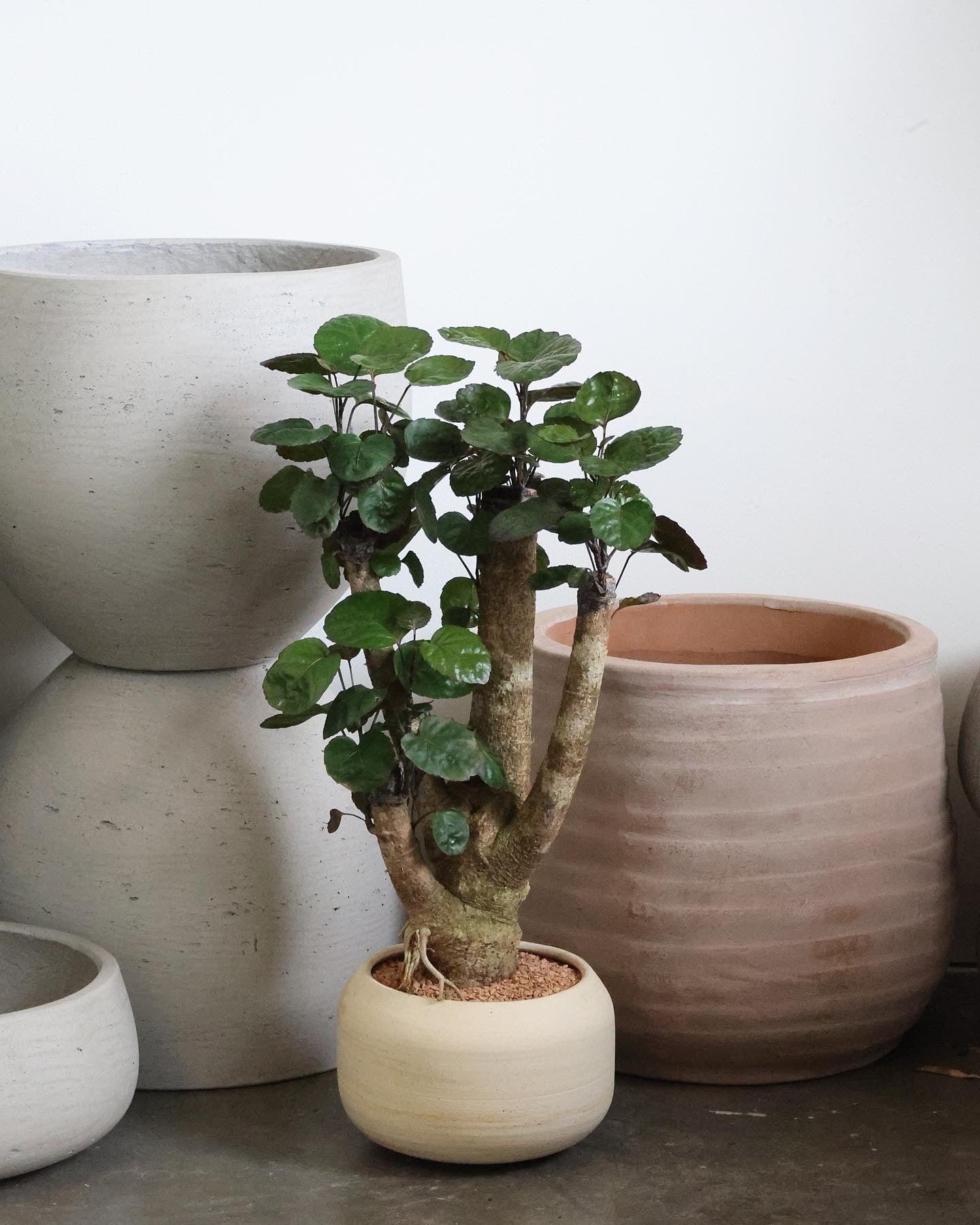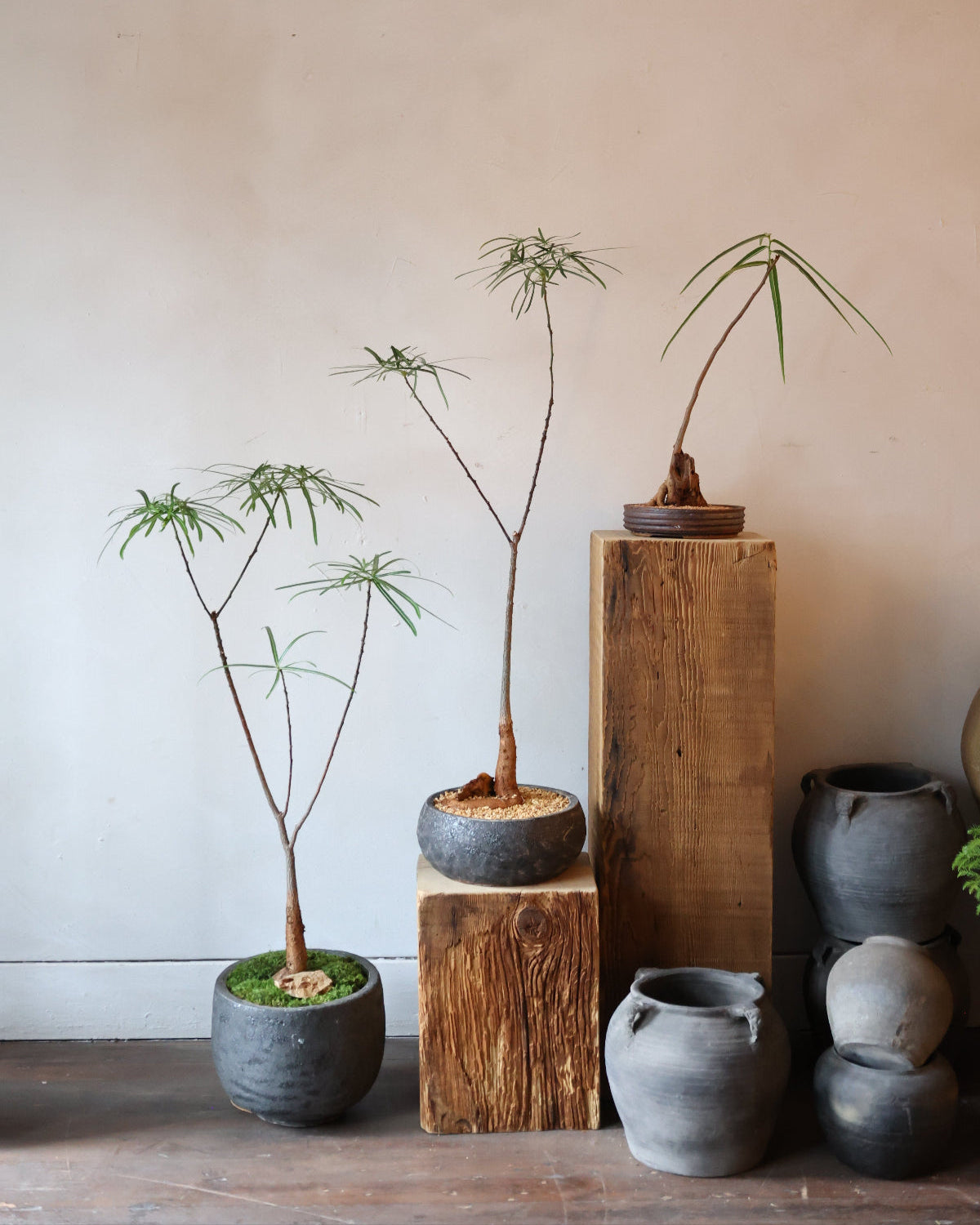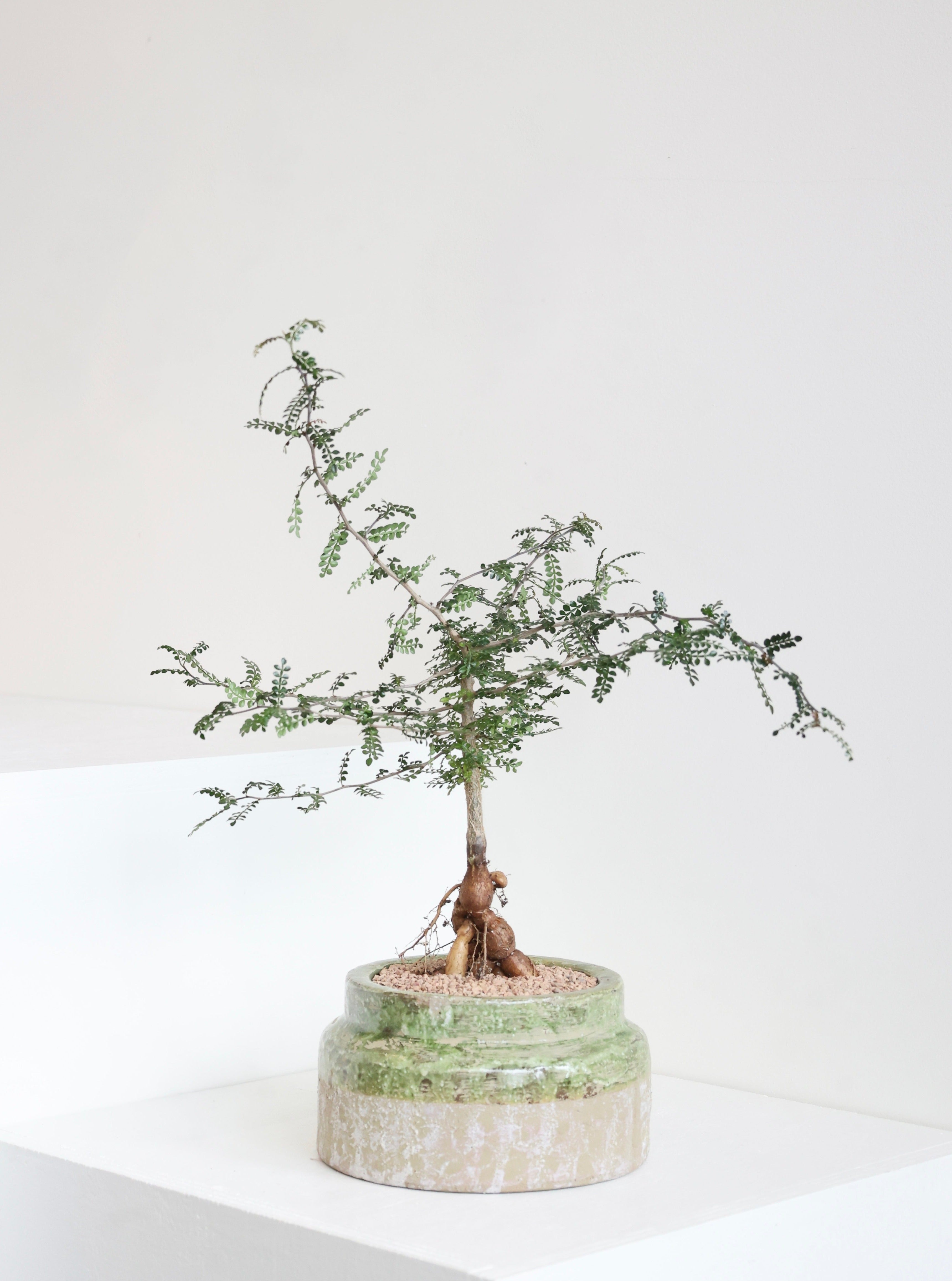 A deciduous succulent tree, prized for its thick, gnarled trunk, delicate, fern-like compound leaves, and bonsai-like appearance.