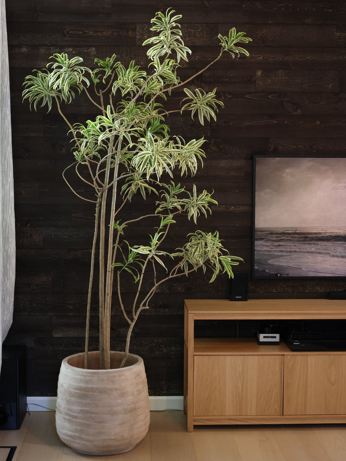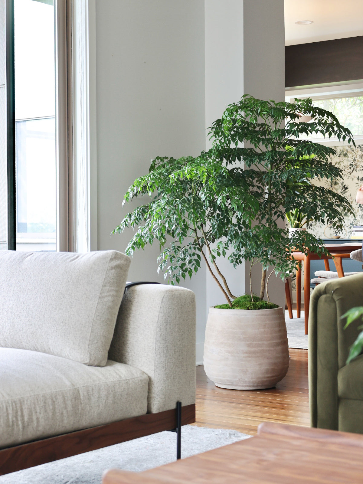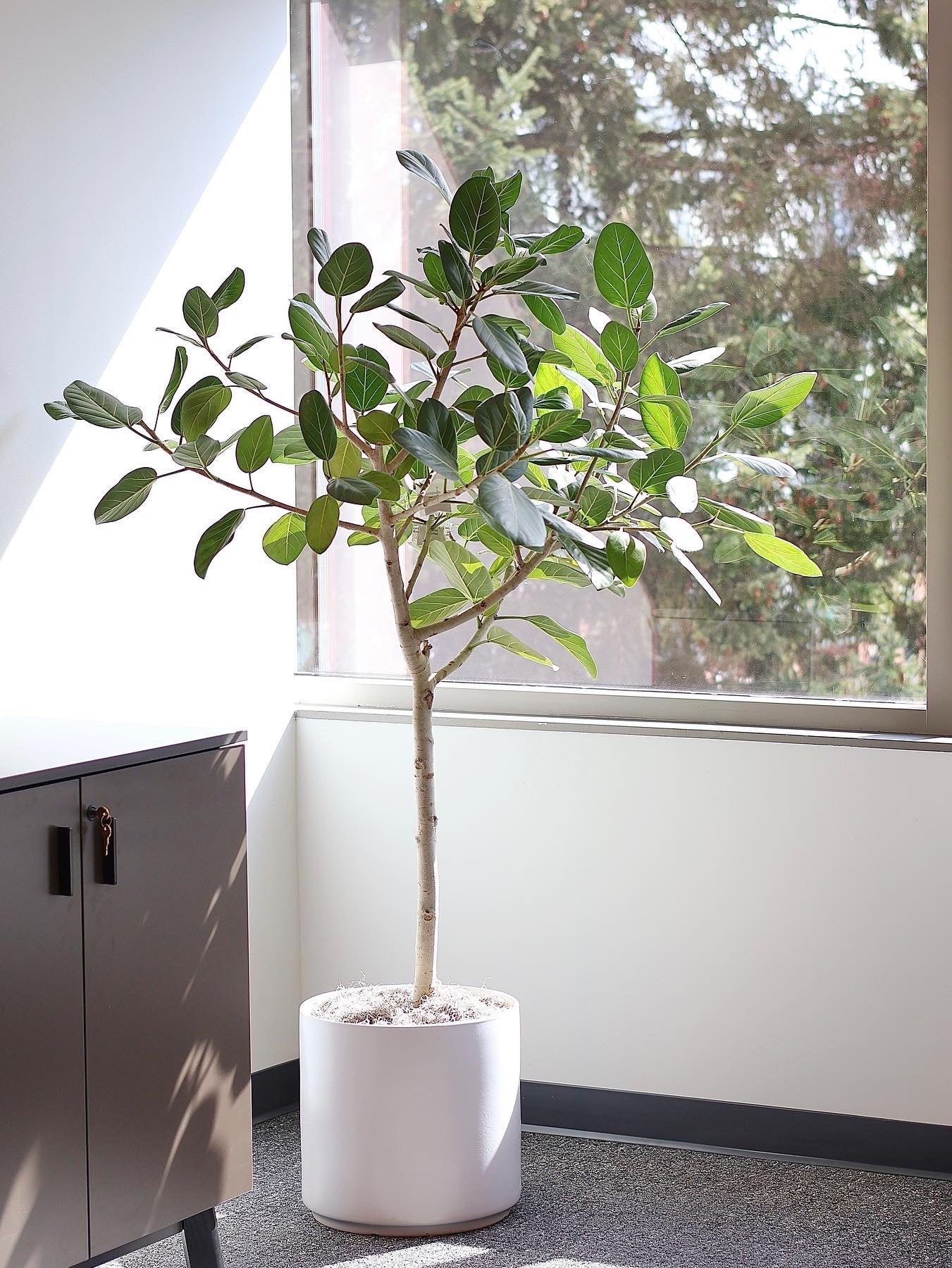An elegant indoor tree known for its deep green leaves and distinctive white bark.