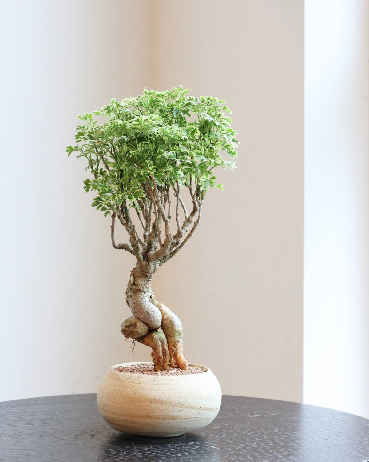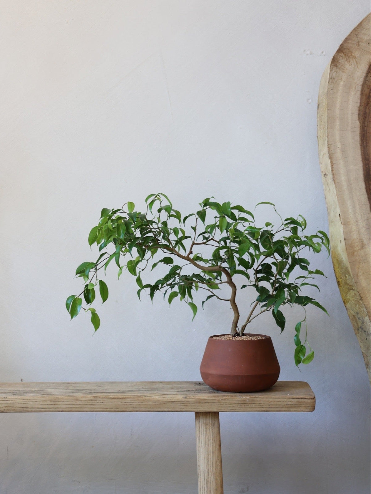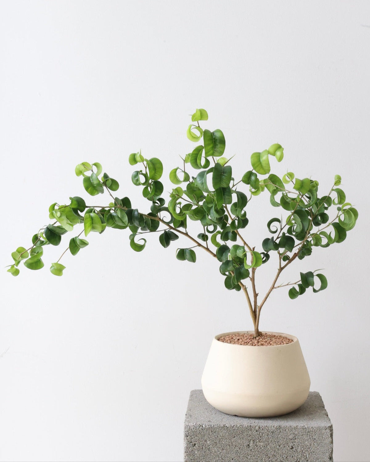 A dwarf cultivar of the weeping fig, featuring small, glossy green leaves and a compact, branching form.