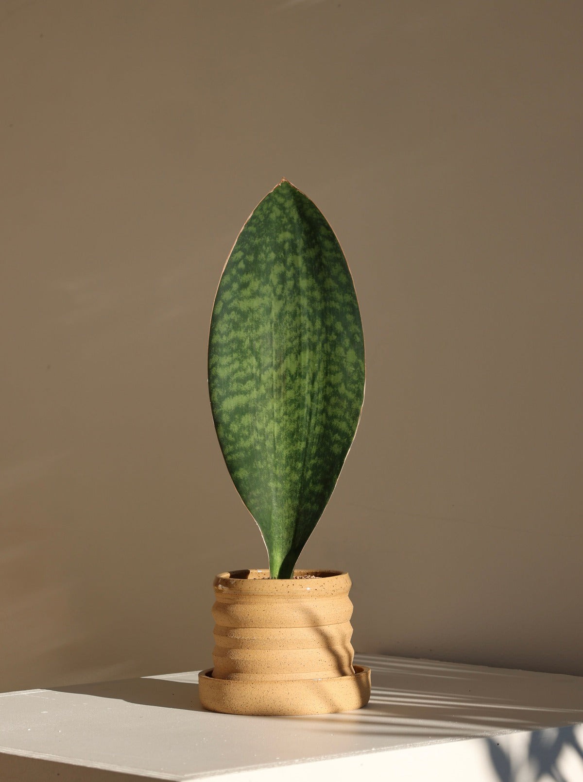 A striking variety of snake plant known for its tall, broad, leathery leaves with distinctive, dark green stripes.