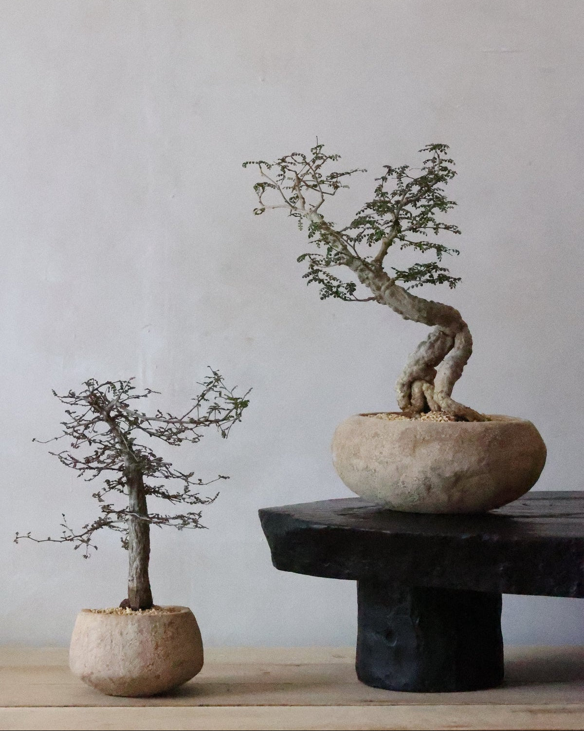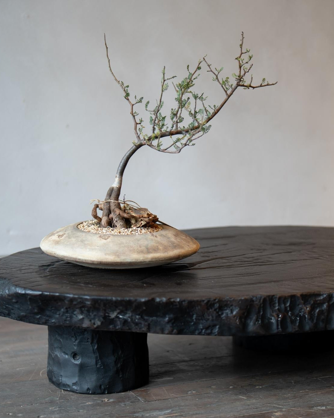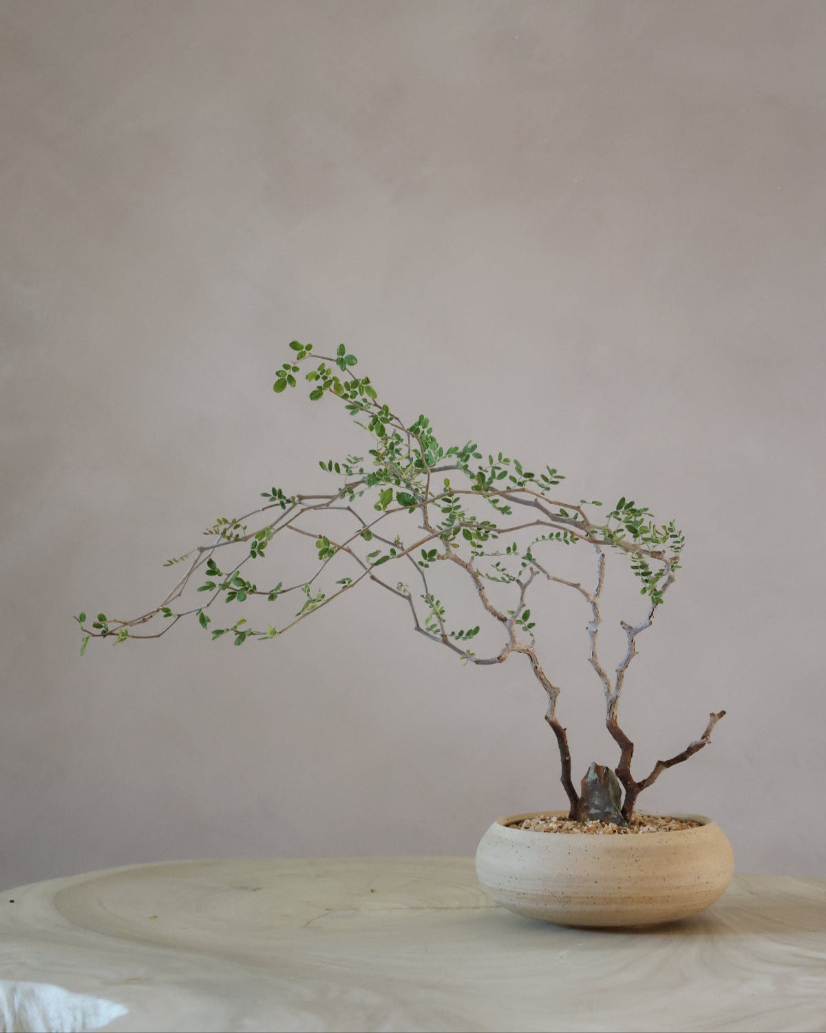 A deciduous succulent tree, prized for its thick, gnarled trunk, delicate, fern-like compound leaves, and bonsai-like appearance.